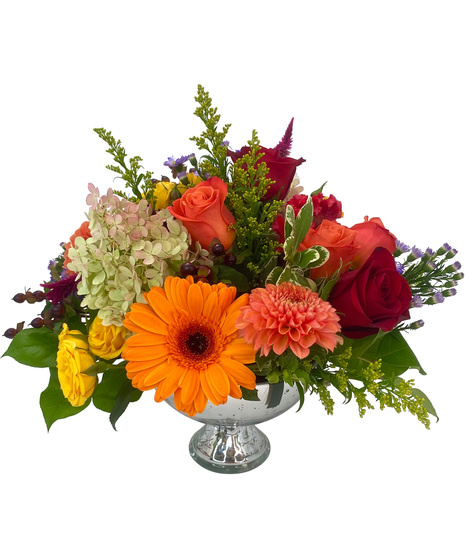 A Gorgeous Seasonal Mix With Fresh Greens Designed In A Keepsake Mercury Glass Bowl