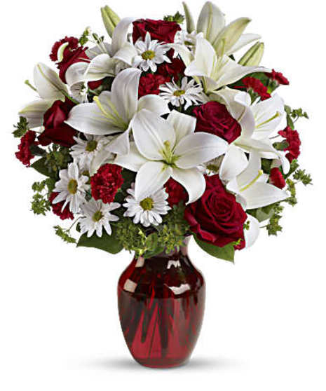 Life's best moments together are about the purity of love; and when you send this captivating Be Mine flower bouquet to someone special, you'll be showing them how much you care. With red roses for love and white lilies and daisies for purity, it's a heavenly gift for your Valentine. Approx. 18” H x 9” W